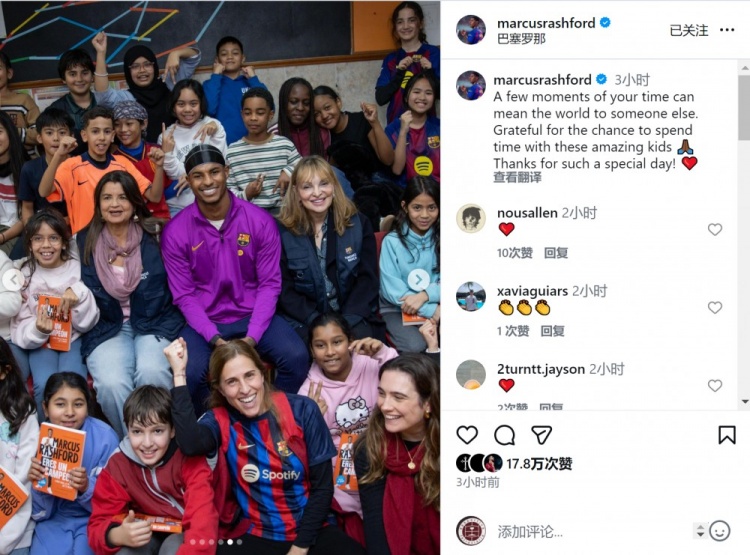 拉什福德社媒晒出与孩子们的合照,并写道:“你片刻的时光,对他人或许意味着整个世界。感恩有机会与这些了不起的孩子们共度时光